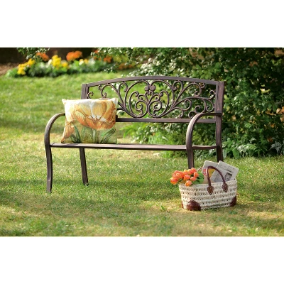 With its cast-iron scroll design, this Blomming Garden bench is crafted with a rust-resistant finish to endure the elements. The contemporary slatted seat, curved arms and arched back with a bronze-finish make a handsome addition to outdoor spaces. 400 lbs. limit.