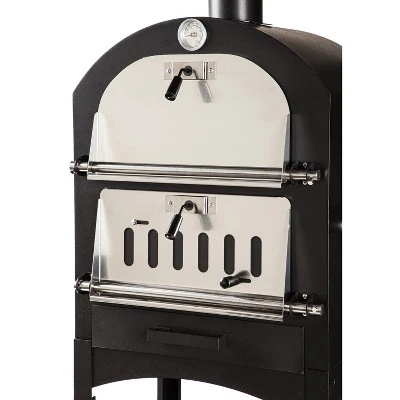 - Can be used as oven or grill and includes sturdy wheels for mobility.