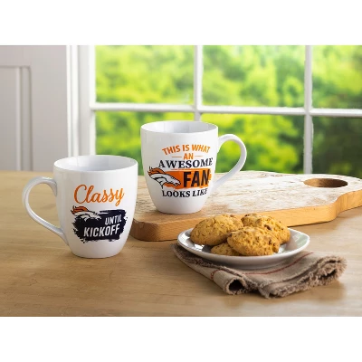 - These mugs have a sleek design and also include playful text to get you ready for gameday. Reads: “This is what an Awesome Fan Looks Like” and “Classy until Kickoff.” Perfect gift for a friend or family member who is a fan of the Denver Broncos.