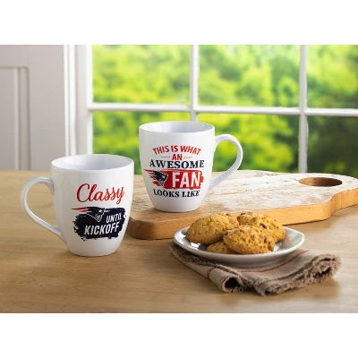 - These mugs have a sleek design and also include playful text to get you ready for gameday. Reads: “This is what an Awesome Fan Looks Like” and “Classy until Kickoff.” Perfect gift for a friend or family member who is a fan of the New England Patriots.