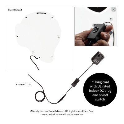 - This LED wall decor is shaped like a hockey helmet and features the official team colors and logo in an HD digitally printed design. Plug-in cord is 86″ long.