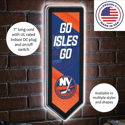 - Officially licensed and made in Fort Worth, Texas. Measures 9″ x 23″ x 0.25″. Show off your team spirit with this New York Islanders Pennant LED Wall Decor.