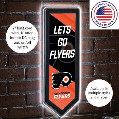 - Officially licensed and made in Fort Worth, Texas. Measures 9″ x 23″ x 0.25″. Show off your team spirit with this Philadelphia Flyers Pennant LED Wall Decor.