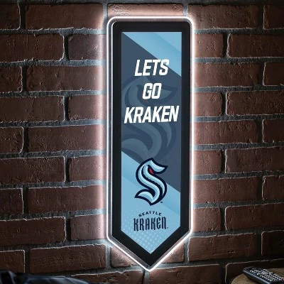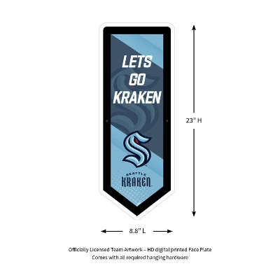 - Officially licensed and made in Fort Worth, Texas. Measures 9″ x 23″ x 0.25″. Show off your team spirit with this Seattle Kraken Pennant LED Wall Decor.